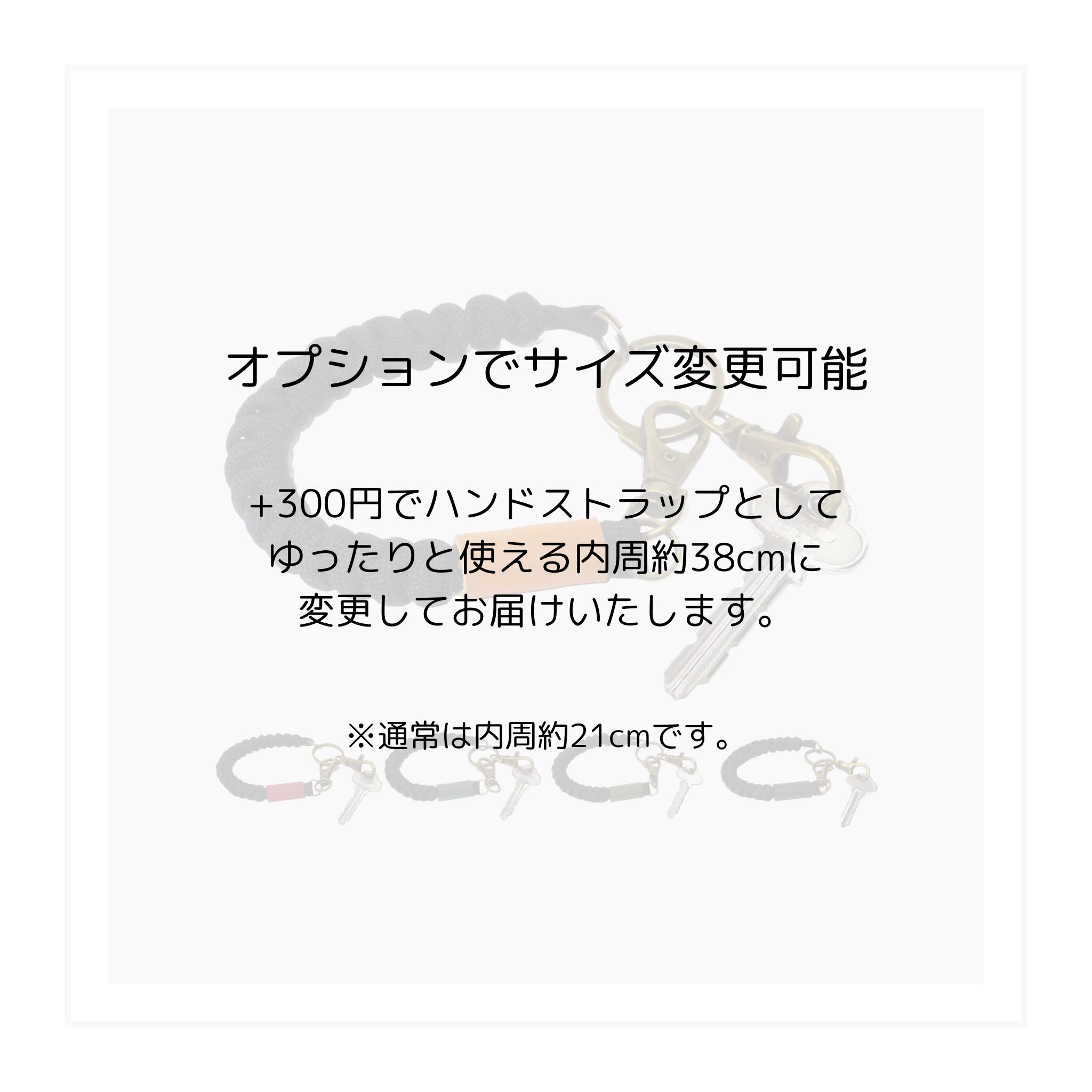 別途オプション(+300円)で、ハンドストラップとしてゆったりと使える内周約38cmに変更可能です。