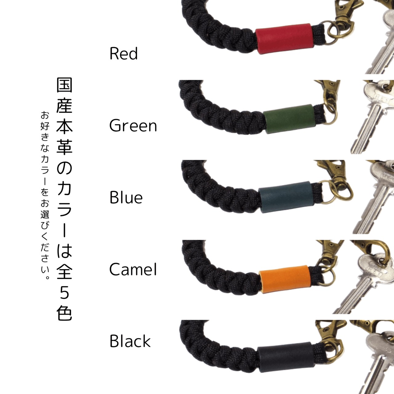 国産本革のカラーは全5色(レッド・グリーン・ブルー・キャメル・ブラック)よりお選びください。